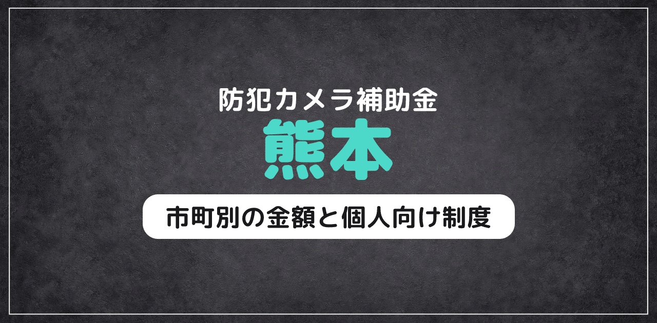 - 熊本県庁単独の防犯カメラ補助金は2026年時点で確認できません。熊本県内の防犯カメラ補助はすべて市町村(熊本市・八代市・天草市・合志市・南小国町・芦北町・多良木町等)が独自に運用しています。そのため、お住まいの市町によって金額・条件・対象が大きく異なります。申請窓口も各市町の防犯担当課となるため、まずは市町村の公式サイトで制度の有無を確認してください。